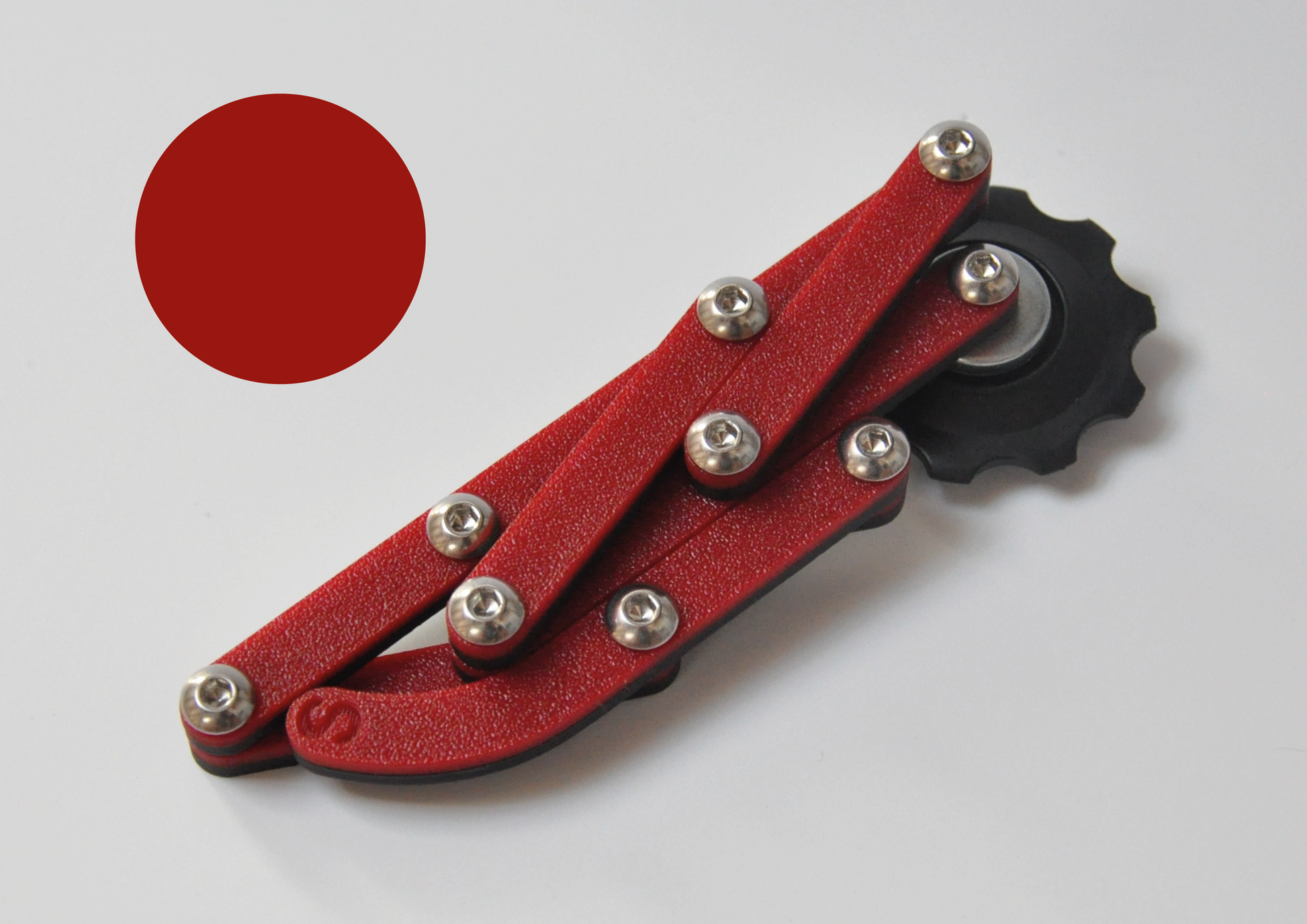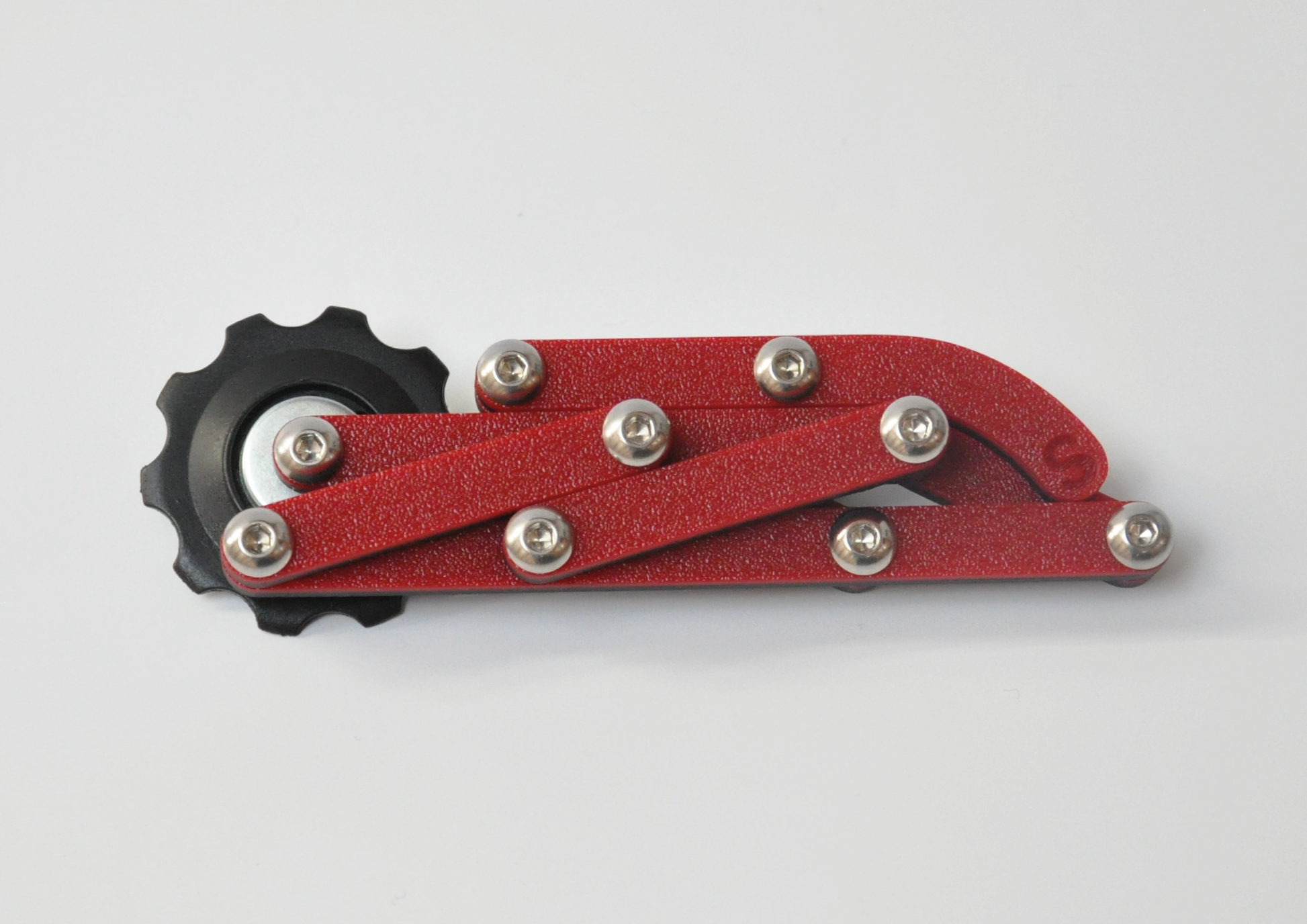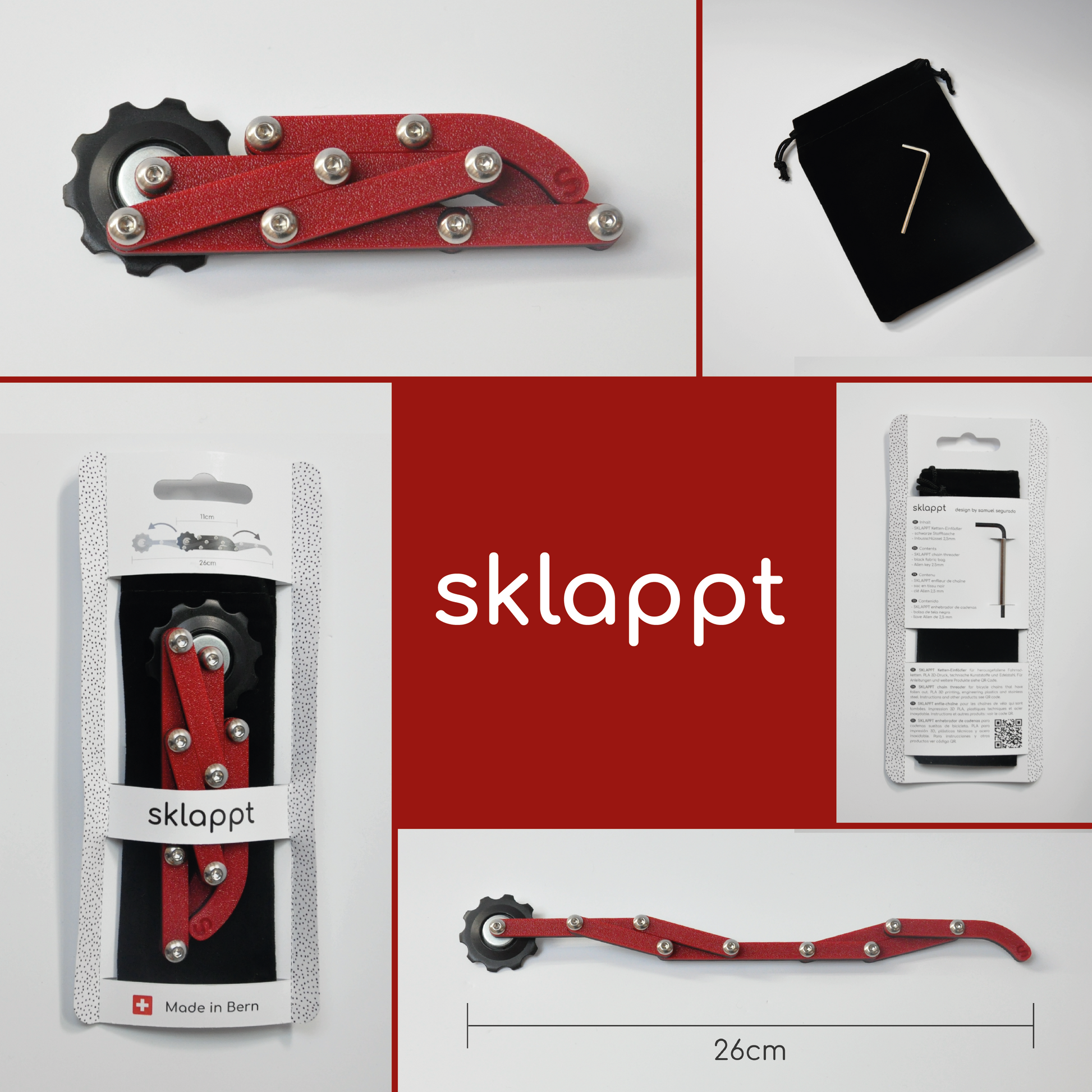 Der SKLAPPT Ketten-Einfädler ist ein Werkzeug für herausgefallene Fahrradketten, welches in seiner vollen Länge 26cm erreicht und auf 11cm zusammengeklappt werden kann. Durch die Klapp-Funktion ist es einfach zu transportieren und schnell einsatzbereit. Der Ketten-Einfädler besteht aus einem Schaltwerk-Rad aus technischem Kunststoff, 3D-gedruckten Verbindungselementen aus PLA und Edelstahlschrauben. Das Produkt wird in limitierter Auflage in Bern hergestellt.