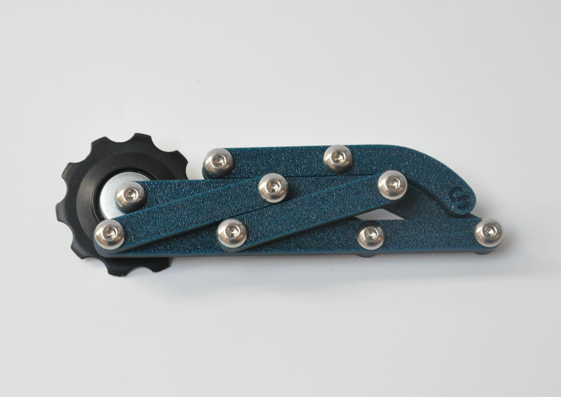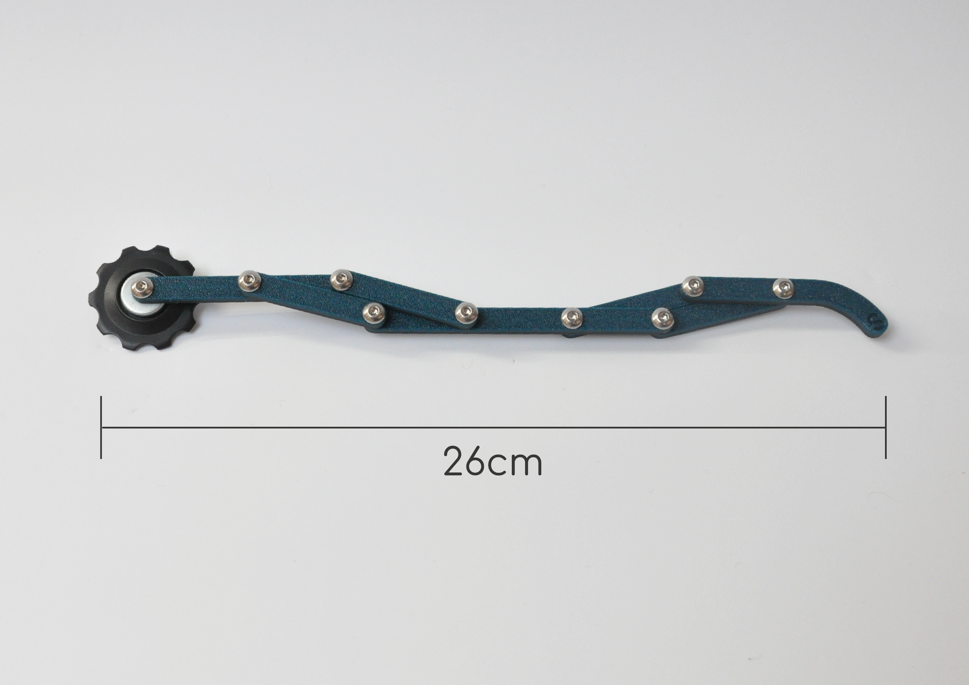 Der SKLAPPT Ketten-Einfädler ist ein Werkzeug für herausgefallene Fahrradketten, welches in seiner vollen Länge 26cm erreicht und auf 11cm zusammengeklappt werden kann. Durch die Klapp-Funktion ist es einfach zu transportieren und schnell einsatzbereit. Der Ketten-Einfädler besteht aus einem Schaltwerk-Rad aus technischem Kunststoff, 3D-gedruckten Verbindungselementen aus PLA und Edelstahlschrauben. Das Produkt wird in limitierter Auflage in Bern hergestellt.